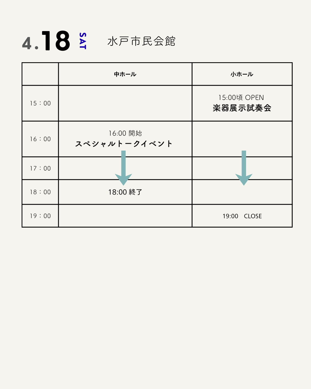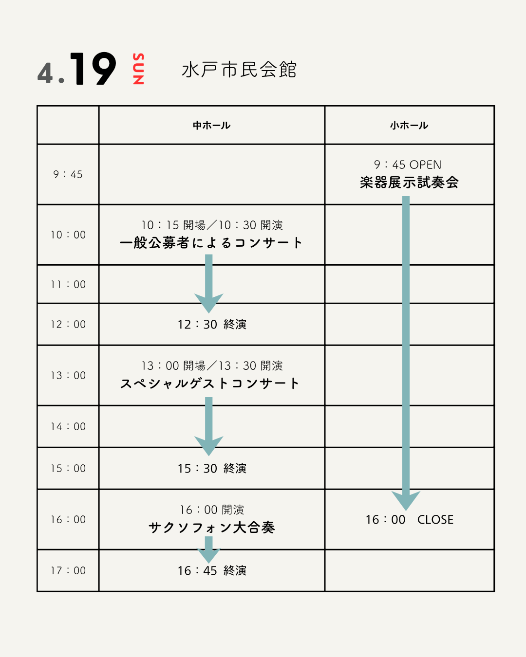 2026.03.06 【サックスフェスタ水戸2026】スケジュール公開 永江楽器水戸創業10周年記念 ~ときめく音に会いにいこう~ 『サックスフェスタ水戸2026』スケジュール公開しました 茨城県にゆかりのあるサックスプレイヤーをゲストにお迎えし、コンサートやトークショーを開催。公募出演者によるコンサートや、参加型のサックス大合奏など、聴いても参加しても楽しいイベントです。各メーカーの楽器やアクセサリーの展示試奏販売ブースなど、最新のサックス情報が集まる二日間。 2026年4月18日(土)、19日(日)会場:水戸市民会館 中ホール ゲスト上野耕平(茨城県東海村出身)五島知美(音楽教室「アミリオ」講師、水戸三高音楽科非常勤講師)坂口大介(茨城県日立市出身、音楽教室「アミリオ」講師)住谷美帆(茨城県水戸市出身) 4月18日(土)《スペシャルトークイベント》ゲスト4名による1日限りの特別講座(入場チケット要)奏法裏技・あなたの楽器プロが吹きます・質問にお答えします!など、貴重な情報が生の声で聞けます! 4月19日(日)《スペシャルゲストによるコンサート》ソロ~カルテットまで、水戸でしか聴けないプレミアムなコンサート(入場チケット要)「サクソフォン大合奏」にお申込みいただくと、コンサートでゲストと一緒に演奏できます。(事前練習、前日リハーサルあり) 《公募出演者によるコンサート》MC:上野耕平(入場無料) 【入場チケット】前売り販売開始:2026年1月17日(土)10:00~4月18日(土) 一律 2,000円4月19日(日) 一般 4,000円、高校生以下 2,000円2日通し券 500円引き当日券 500円増し 【サクソフォン大合奏】受付開始:2026年1月17日(土)10:00 ~ 2月28日(土)19:00 先着順参加料金 一般 6,000円、高校生以下 4,000円 ※2日通し券入場チケット付き 【コンサート出演者公募】受付開始:2026年2月1日(日)10:00 ~ 3月8日(日)19:00 先着順参加料金 出演者1名につき 5,000円 ※4/19(日)の入場チケット付き お問い合わせは永江楽器水戸まで(Tel. 029-226-6540) « 前の記事 一覧へ